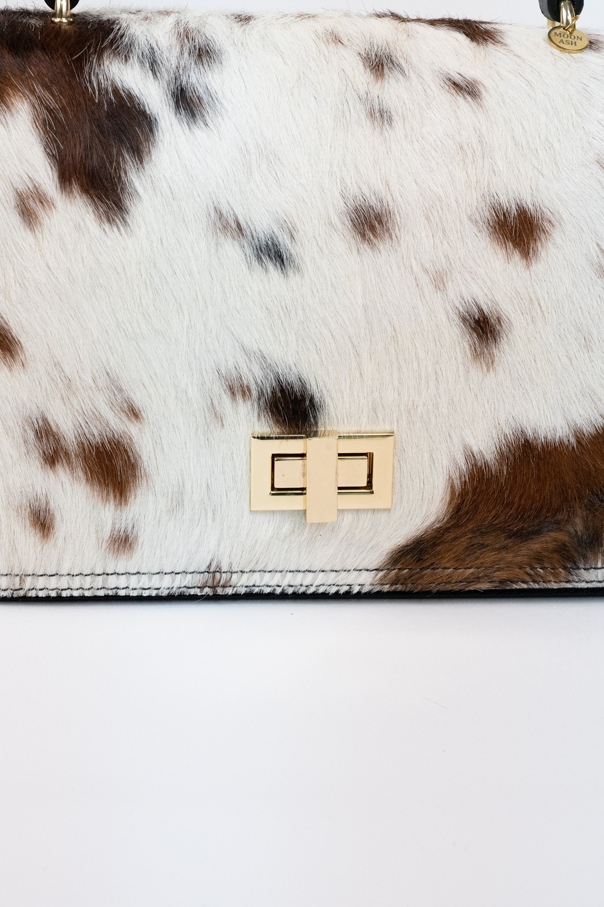 El Bolso Velour está confeccionado en piel italiana de primera calidad, seleccionada por su suavidad, resistencia y durabilidad. Su superficie presenta un estampado de vaca uniforme y definido, obtenido mediante un proceso de curtición que garantiza estabilidad en el color y un tacto agradable.