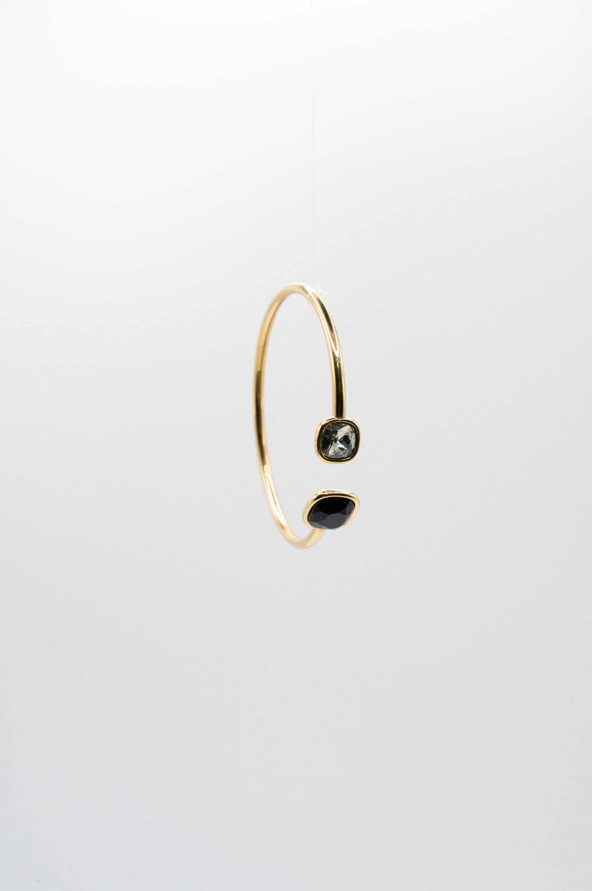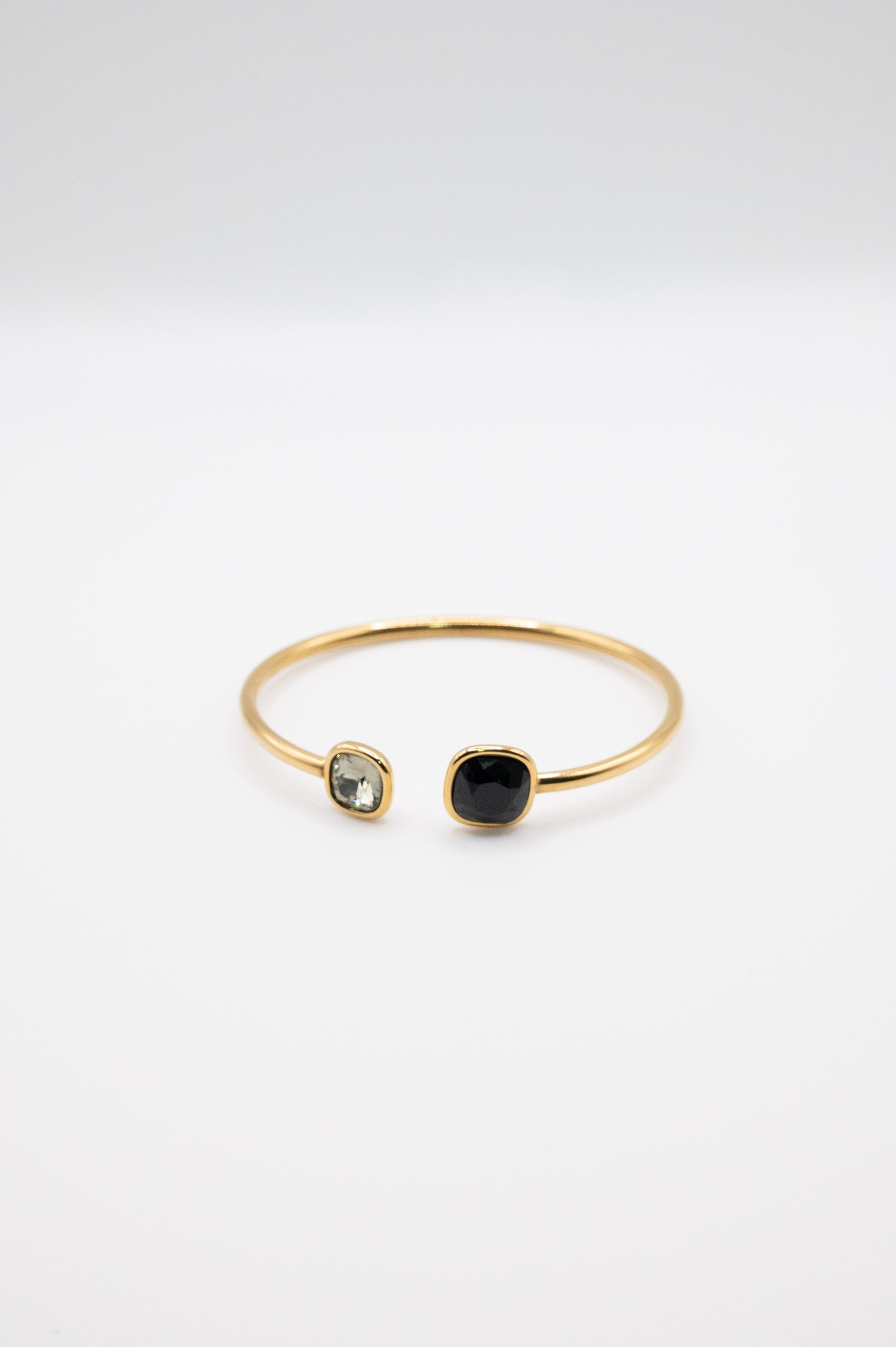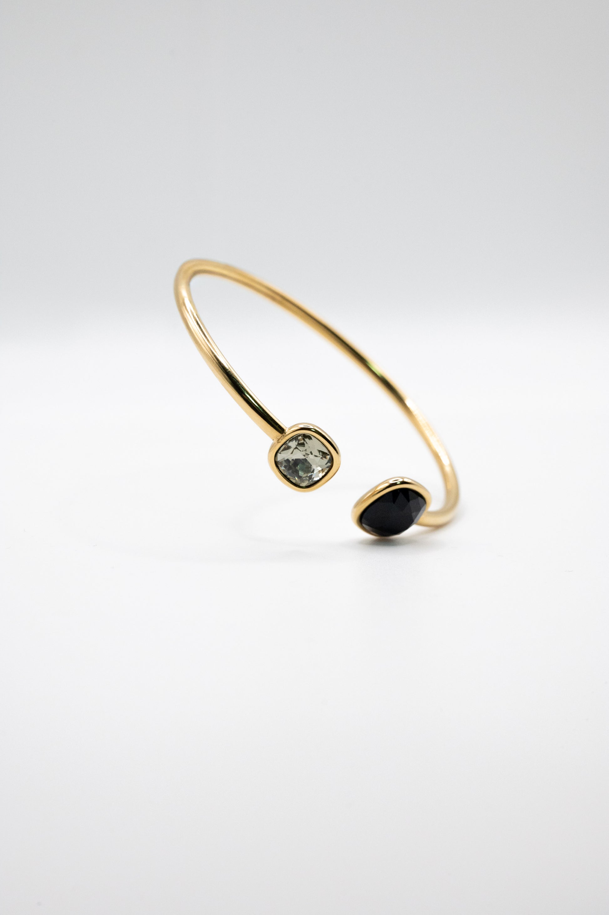 Brazalete abierto de acero inoxidable en tono dorado, con un diseño minimalista y elegante. En cada extremo lleva una piedra facetada: una clara, de tono gris translúcido, y otra negra. El contraste entre ambas piedras le da un estilo moderno y sofisticado
