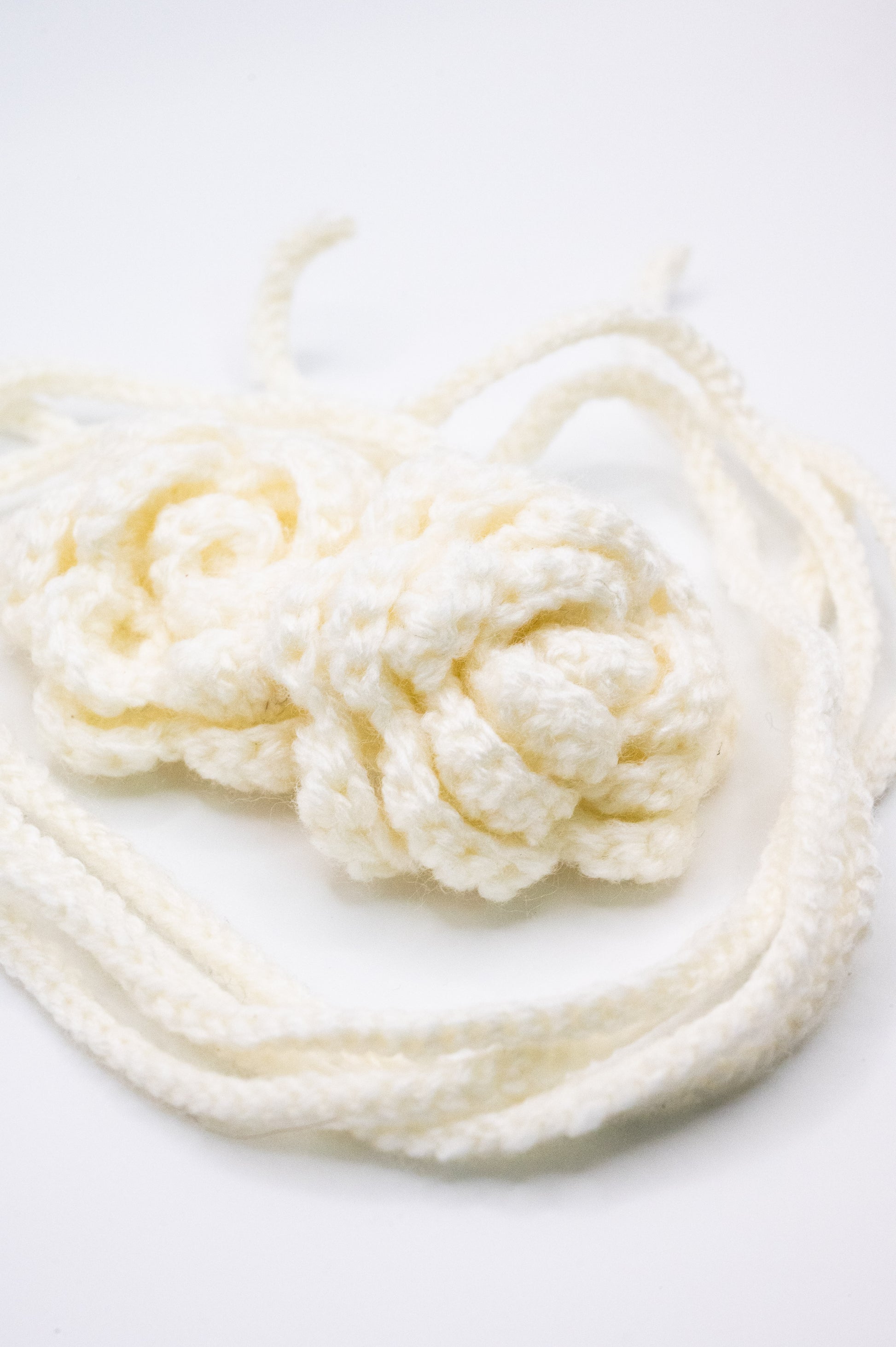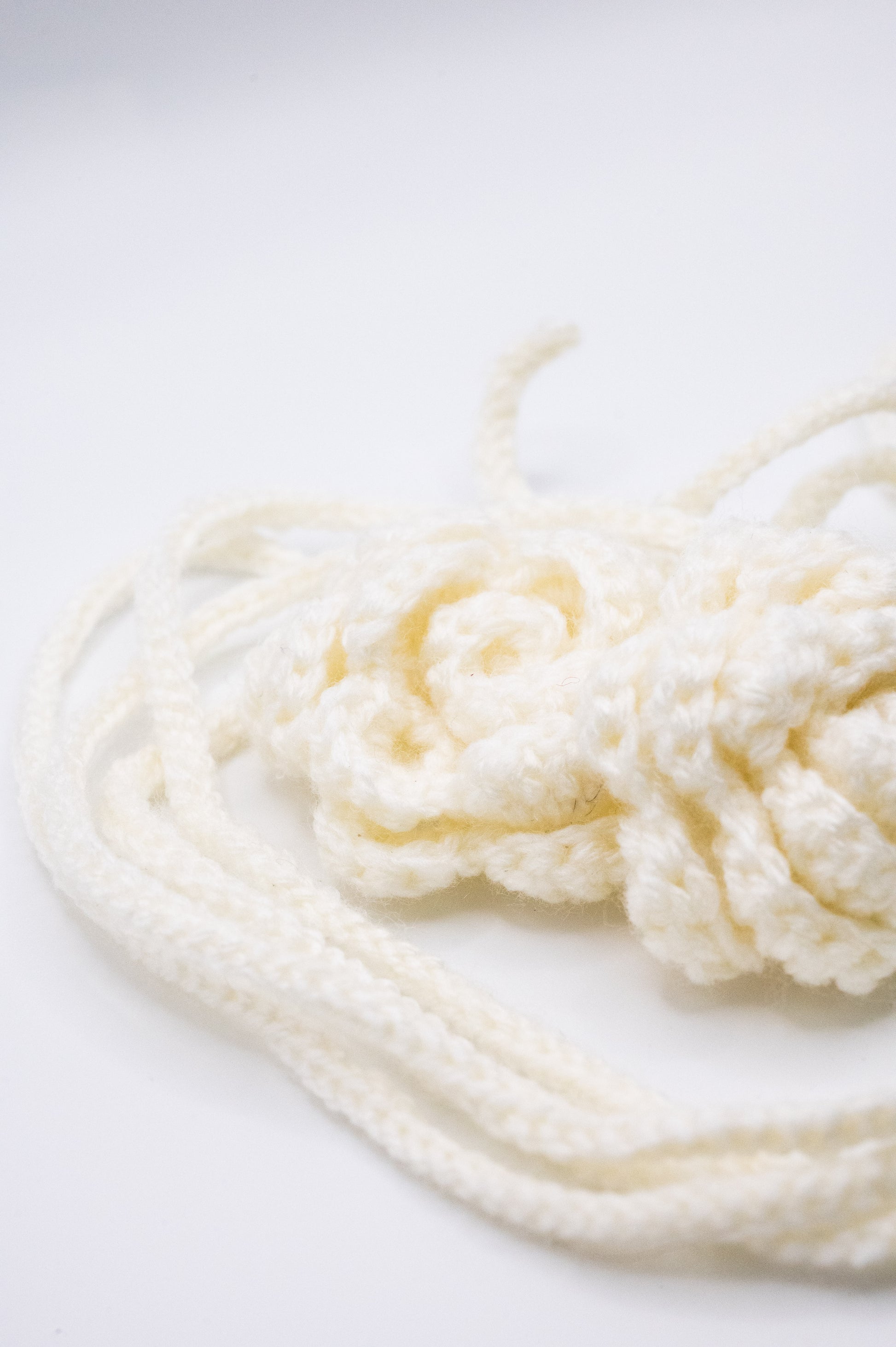 Cada pieza combina una flor tejida con una delicada tira de ganchillo para atar.