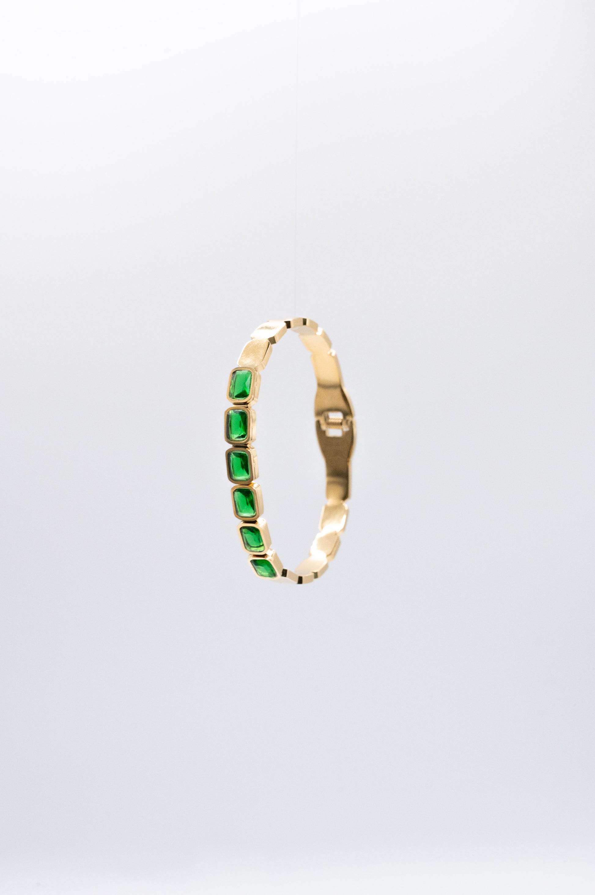 Brazalete de acero inoxidable con apertura frontal, diseñado para colocar y ajustar fácilmente. Presenta piedras incrustadas en un vibrante tono verde, que añaden un toque elegante y luminoso.